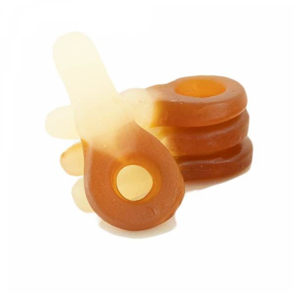 Caramelle gommose dure, a forma di ciuccio, al gusto cola.
