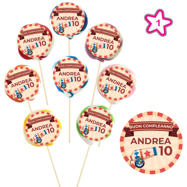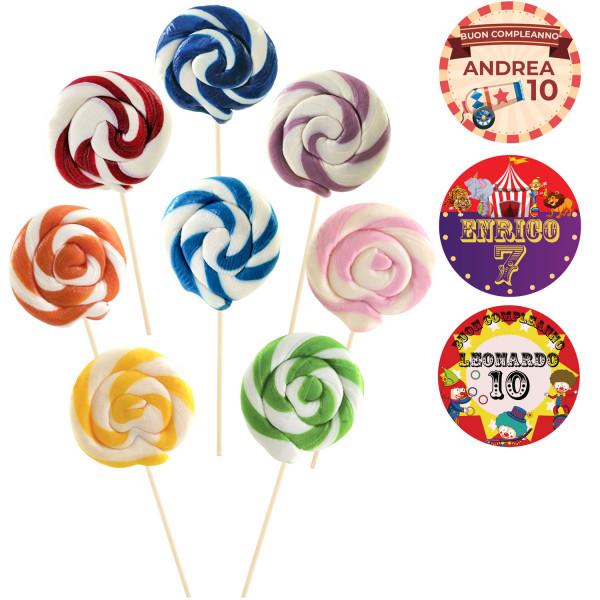 Lecca lecca tondo 25g personalizzato ideale per la tua festa di compleanno a tema e tutta colorata.