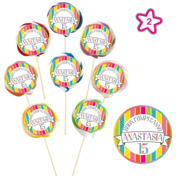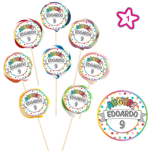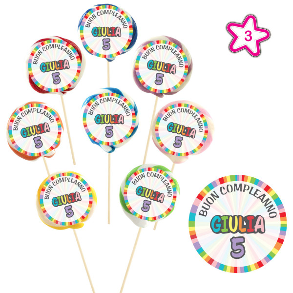 Lecca lecca tondo 25g personalizzato ideale per la tua festa di compleanno a tema e tutta colorata.