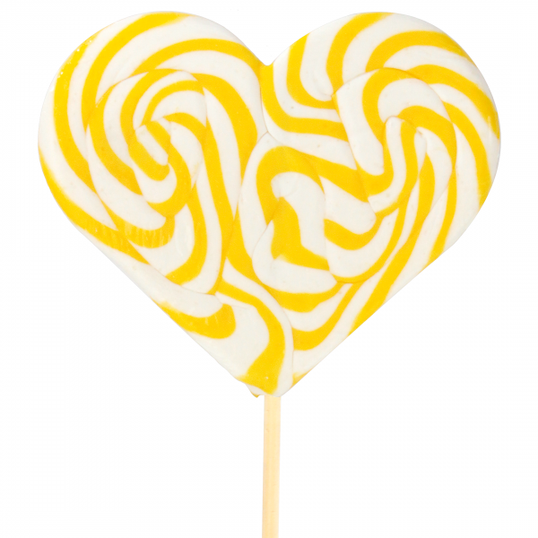 Lecca lecca artigianali a forma di cuore, di colore giallo, al gusto limone.
