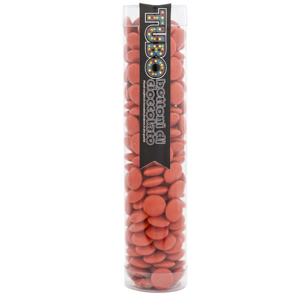Tubo in acetato contenente bottoni di cioccolato fondente confettato di colore rosso.
